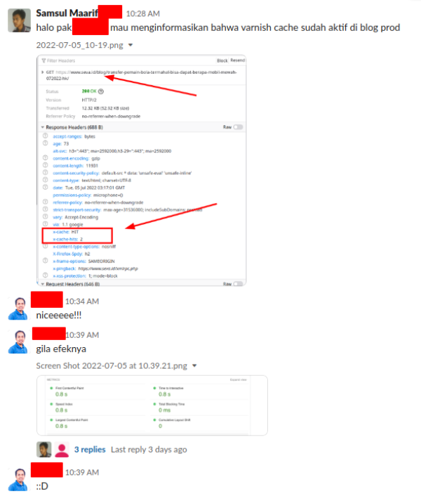 pada header X-Cache, jika nilainya MISS artinya belum di-cache oleh varnish, HIT artinya sudah ada cache. Berikut testismoni dari salah satu bos saya: